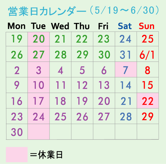 2014/5/19(月)以降の営業日カレンダーを作成いたしました。